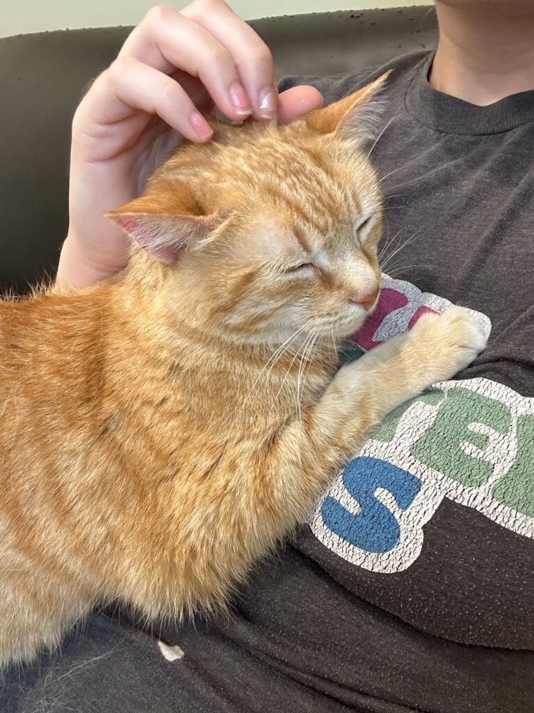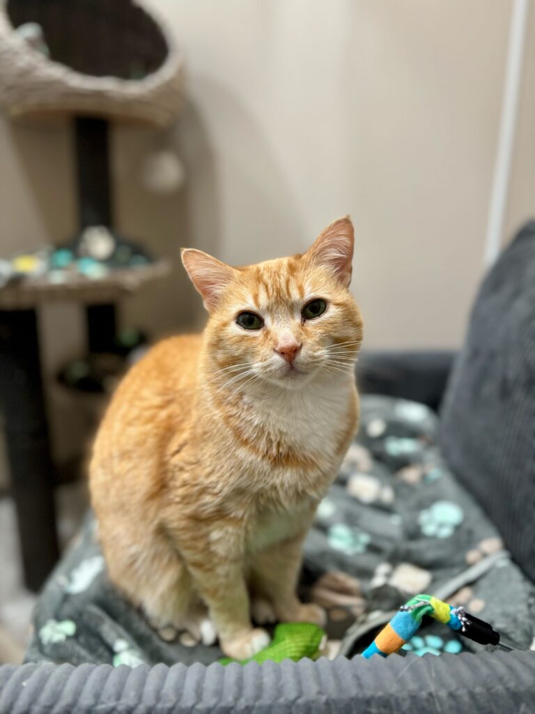 Hello darlings, I’m Victoria. Yes, the Victoria. I’m a 12-year-old orange tabby who enjoys the finer things in life: sunshine, peace, and a perfectly fluffed bed. I may be a little shy when meeting new people (a queen must be cautious), but here at Young at Heart’s adoption center, I’ve found my perfect kingdom.